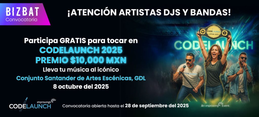 CodeLaunch LATAM, en alianza con BizBat, lanza una convocatoria nacional para seleccionar al acto musical encargado de abrir su edición 2025, la cual se llevará a cabo el próximo 8 de octubre en el Conjunto Santander de Artes Escénicas, uno de los recintos más importantes de la ciudad de Guadalajara.