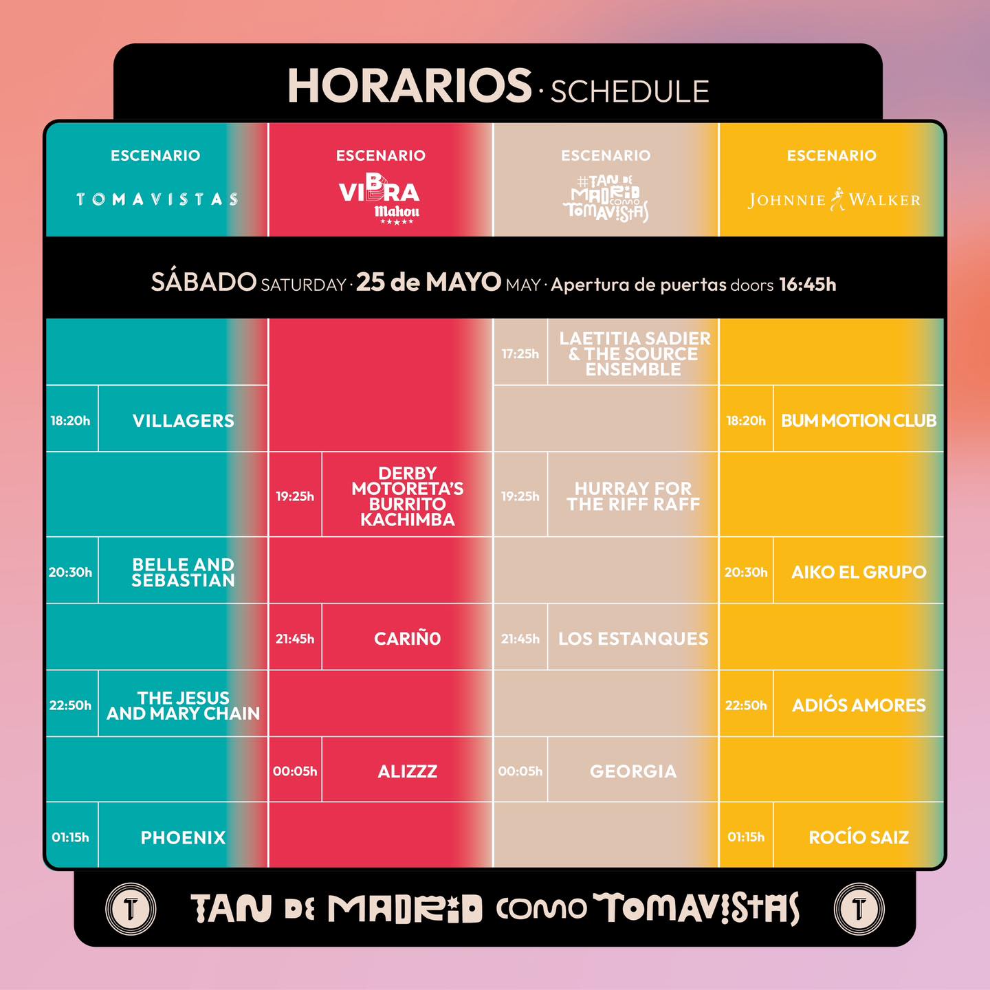 El sábado 25, también se abren puertas a las 16:45 (hora Madrid), y comienza con Laetitia Sadier and the source ensemble, proyecto independiente de la vocalista de Stereolab, Lætitia Sadier, y concluye con la actuación de la banda francesa Phoenix.