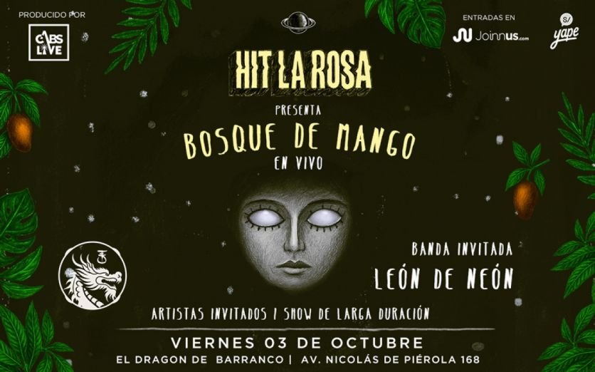 Este 03 de octubre Hit la Rosa te espera en El Dragón de Barranco para presentar “Bosque de Mango”, acompañado de la banda León de Neon, quien abrirá la noche. Las entradas están disponibles a través de Joinnus con precios de preventa desde S/30 y S/45 en puerta. Además, se ofrecerá merch exclusiva de la banda.