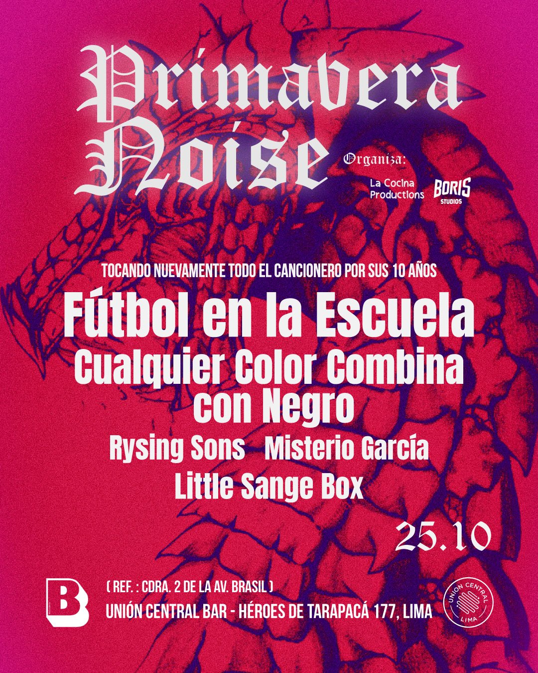 El cartel de Primavera Noise reúne a proyectos que también le dan identidad al sonido independiente limeño. Cualquier color combina con negro desplegará su mezcla entre post punk y shoegaze; Misterio García propondrá su particular manera de construir atmósferas; Rysing Sons aportará su visión post rock con influencias londinenses; y Little Sange Box completará la noche con su energía entre lo progresivo y lo experimental.