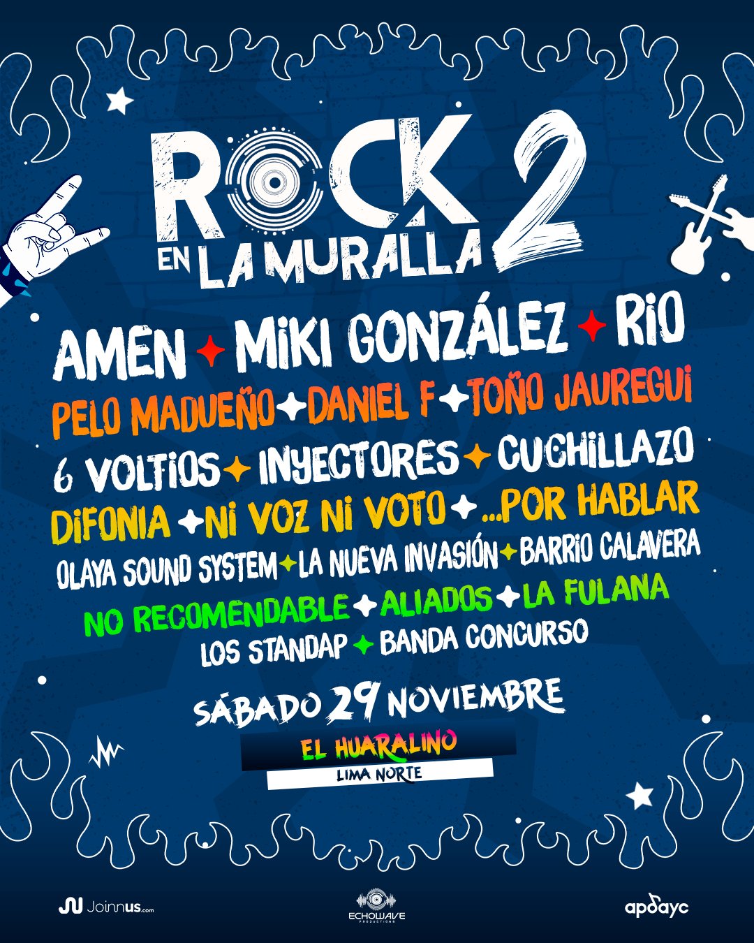 El cartel es un espejo fiel de la diversidad del Huaralino. Veremos a Amén, Miki González, RIO y Pelo Madueño. A ellos se unen los solistas Daniel F, Toño Jauregui, No Recomendable y La Fulana. La potencia punk rock llega con Inyectores, 6 Voltios y Cuchillazo. La fusión está representada por La Nueva Invasión, Olaya Sound System y Barrio Calavera. Finalmente, el alternativo tiene a Difonia, Ni Voz Ni Voto, …Por Hablar y Aliados, junto a la propuesta de Los Standap. Esta selección completa reafirma la descentralización, confirmando que la zona norte de Lima retiene su importancia como polo cultural indispensable.