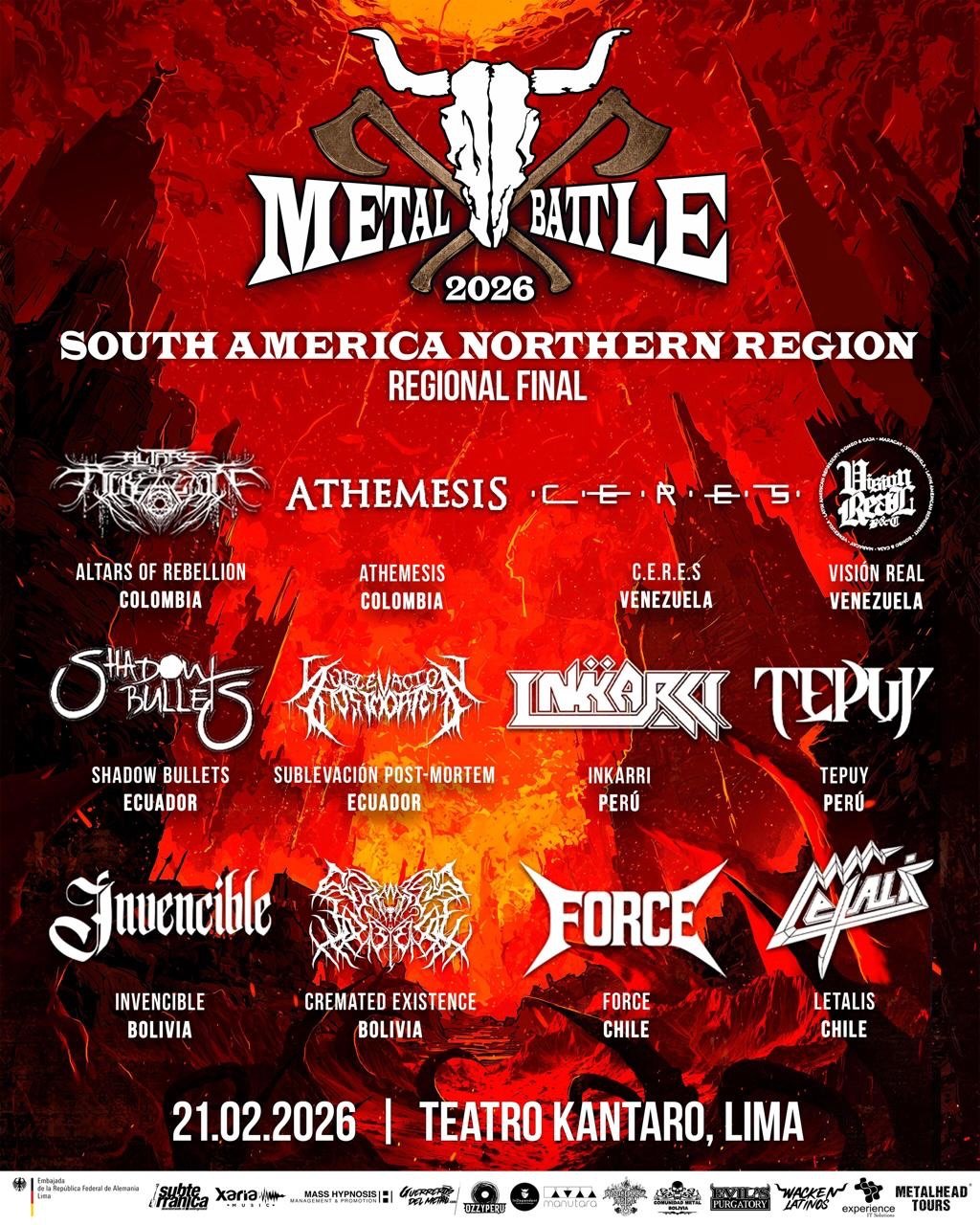 El cartel de finalistas se completa con representantes de altísimo nivel como Altars of Rebellion y Athemesis de Colombia, C.E.R.E.S y Visión Real de Venezuela, Shadow Bullets y Sublevación Post-Mortem de Ecuador, además de Invencible y Cremated Existence de Bolivia. Esta reunión de talentos permite que el público peruano aprecie la diversidad de estilos que conviven en el continente, desde el death metal más crudo hasta el heavy metal tradicional. La integración de estas bandas en un mismo escenario fortalece los vínculos entre nuestras industrias musicales y genera espacios de intercambio que benefician a todo el sector independiente.