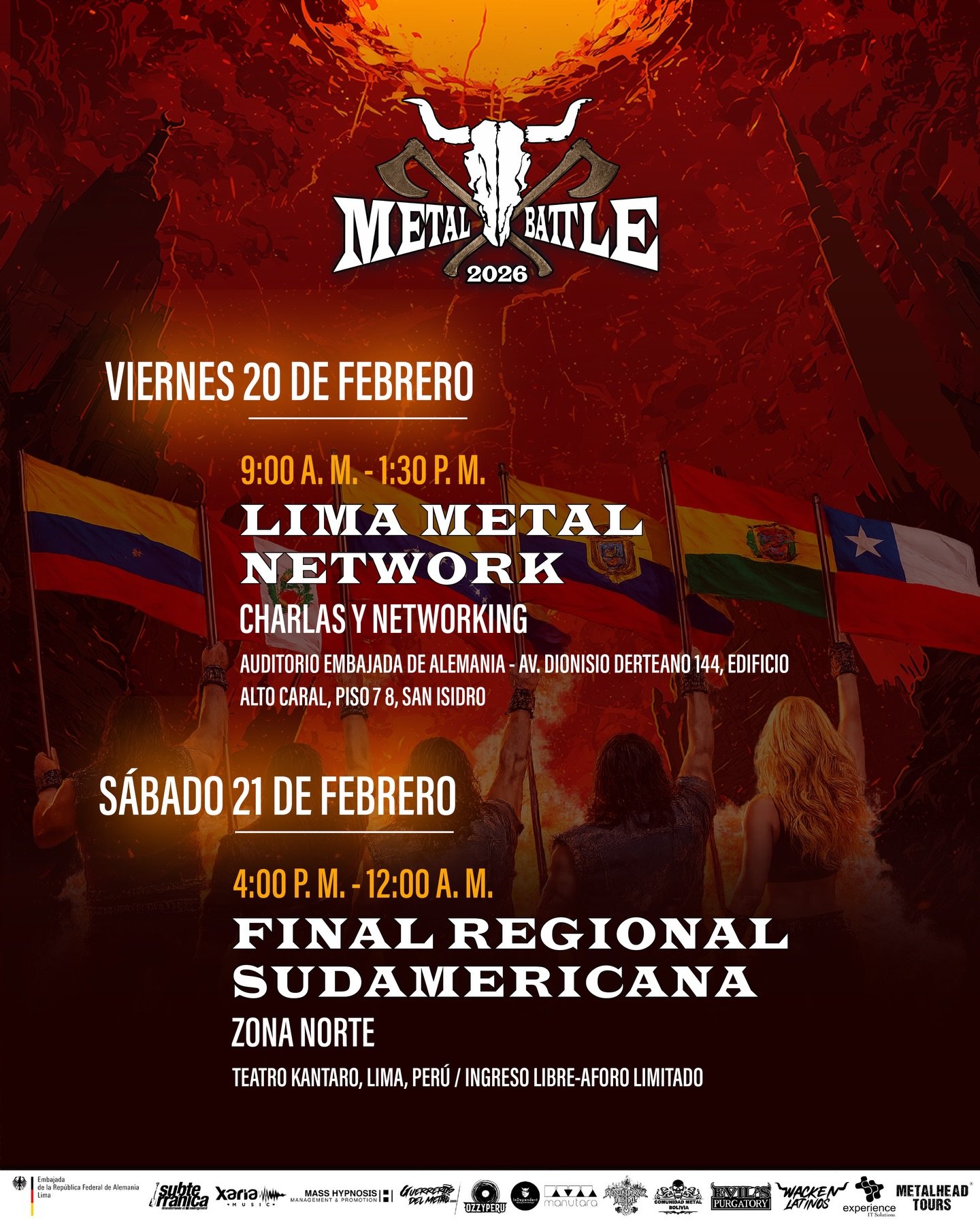 Esta edición del festival refuerza la buena relación histórica entre las escenas de Perú y Chile, demostrando que la música pesada funciona como un punto de encuentro ideal para la fraternidad latinoamericana. Este viernes viernes 20 de febrero se desarrollará una jornada extensa de networking y paneles profesionales de intercambio en el Auditorio de la Embajada de Alemania, preparando el camino para el show principal del sábado 21 desde las 16:00 horas en el Teatro Kantaro de la Avenida Tacna 225. El INGRESO es LIBRE y el aforo es limitado, así que vayan desde temprano.